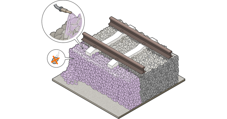 Hierbei handelt es sich nicht um eine Injektion im klassischen Sinn. Das Injektionsmaterial wird bei der Verklebung nur auf den Schotter aufgesprüht und bildet so eine schützende und verklebende Schicht auf dem Untergrund. Aus dem losen Schotter entsteht so ein solider Block, welcher von sich aus an Ort und Stelle bleibt.