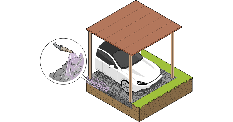 Stabilization with tough, elastic PU grouts allows the benefits of such loosely laid bases to be preserved while eliminating virtually all the disadvantages. Nor is water permeability in any way affected. The PU grout is used to wet the gravel/chippings and thereby bond the contact areas between the individual stones. Thanks to the material's low viscosity, the voids between the stones remain open and rainwater drainage is guaranteed.