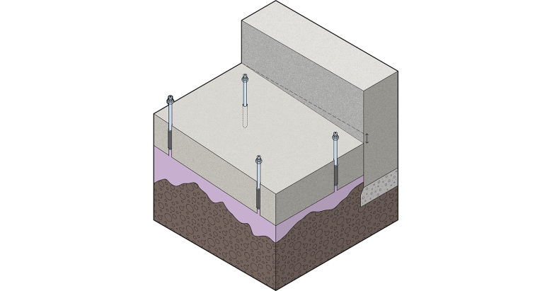 Various injection products are available for this purpose, with selection depending on subsoil composition. Foaming resins are unsuitable for this type of consolidating injection as their volumetric expansion may ultimately increase the instabilityof the foundations.